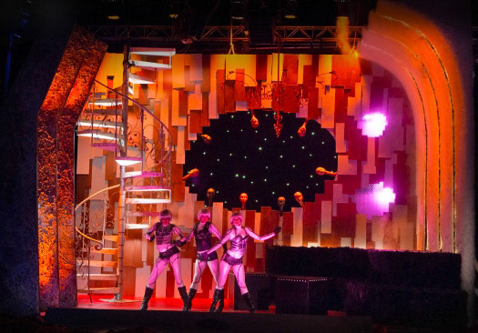 After seeing the Android dancers and learning about the theme and script, I simply decided to play with the idea of placing this set in a floating, surreal, futuristic, 60's style world; a la Barbarella. I definitely didn't want to go obvious and predictable! The B-Movie feel is intentional. Well aware of the possible consequences, we went for it!