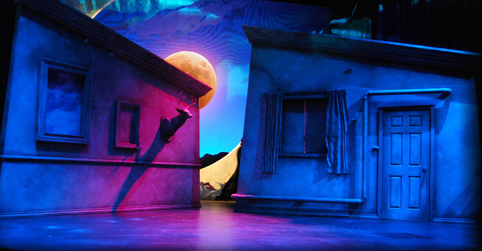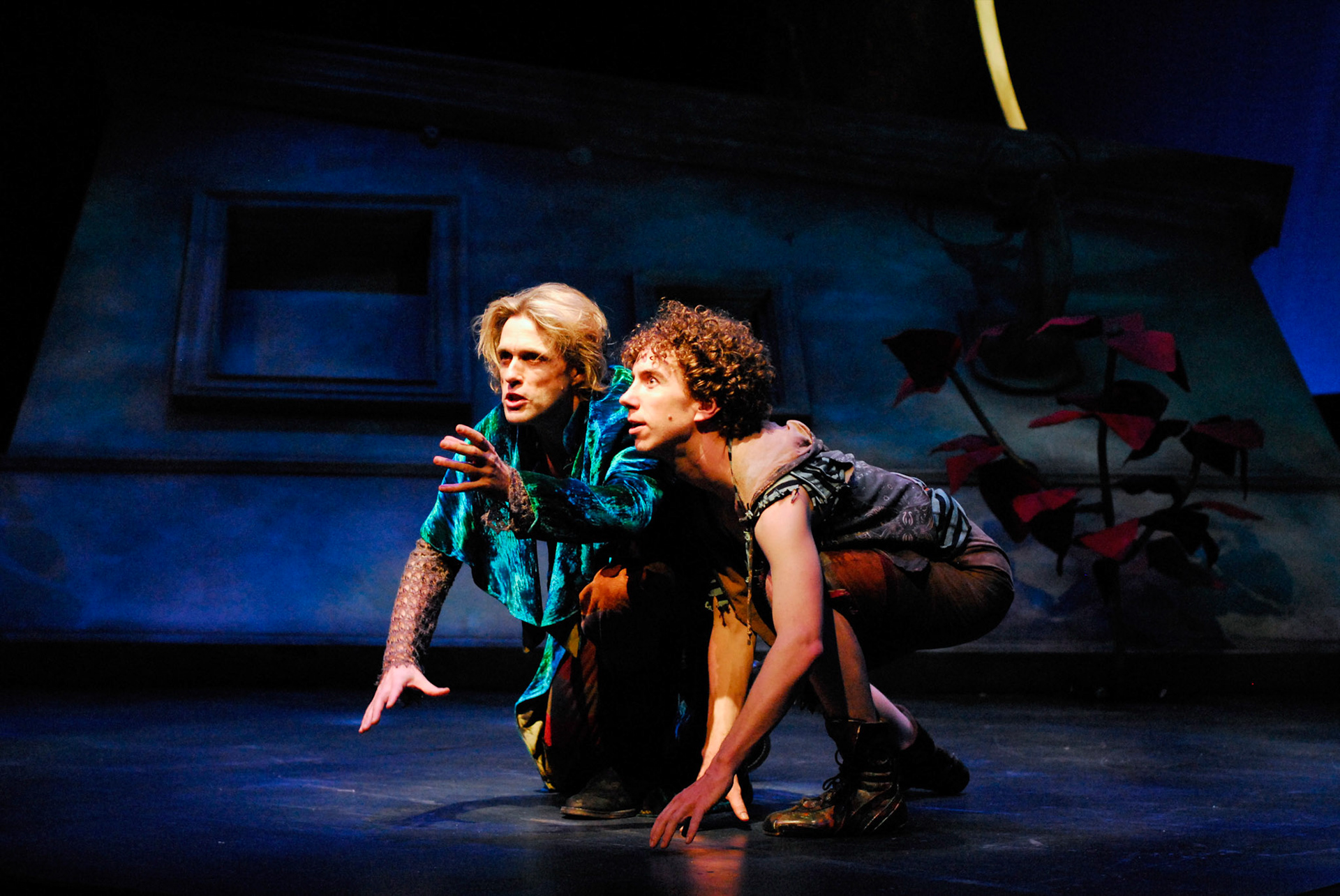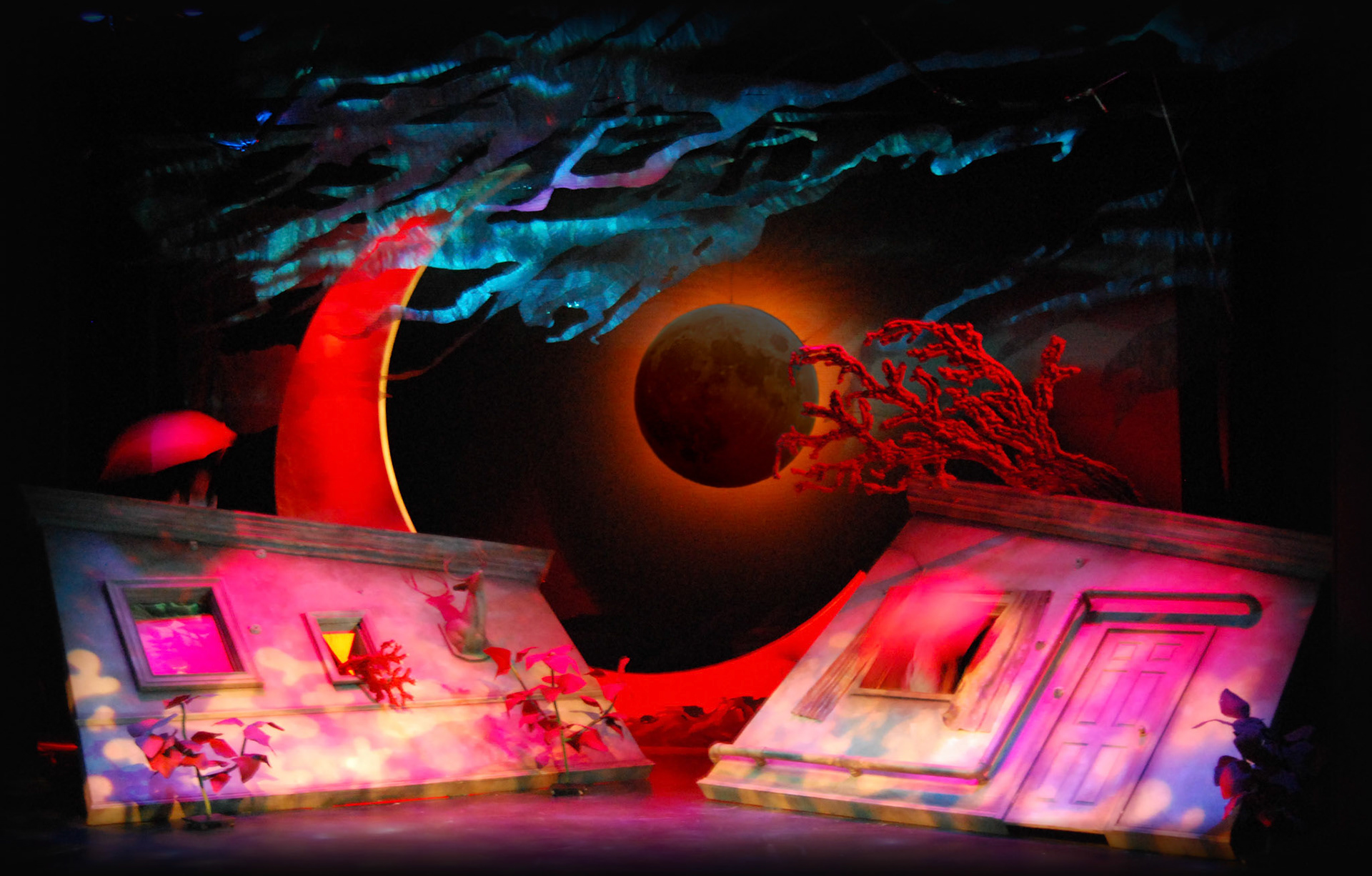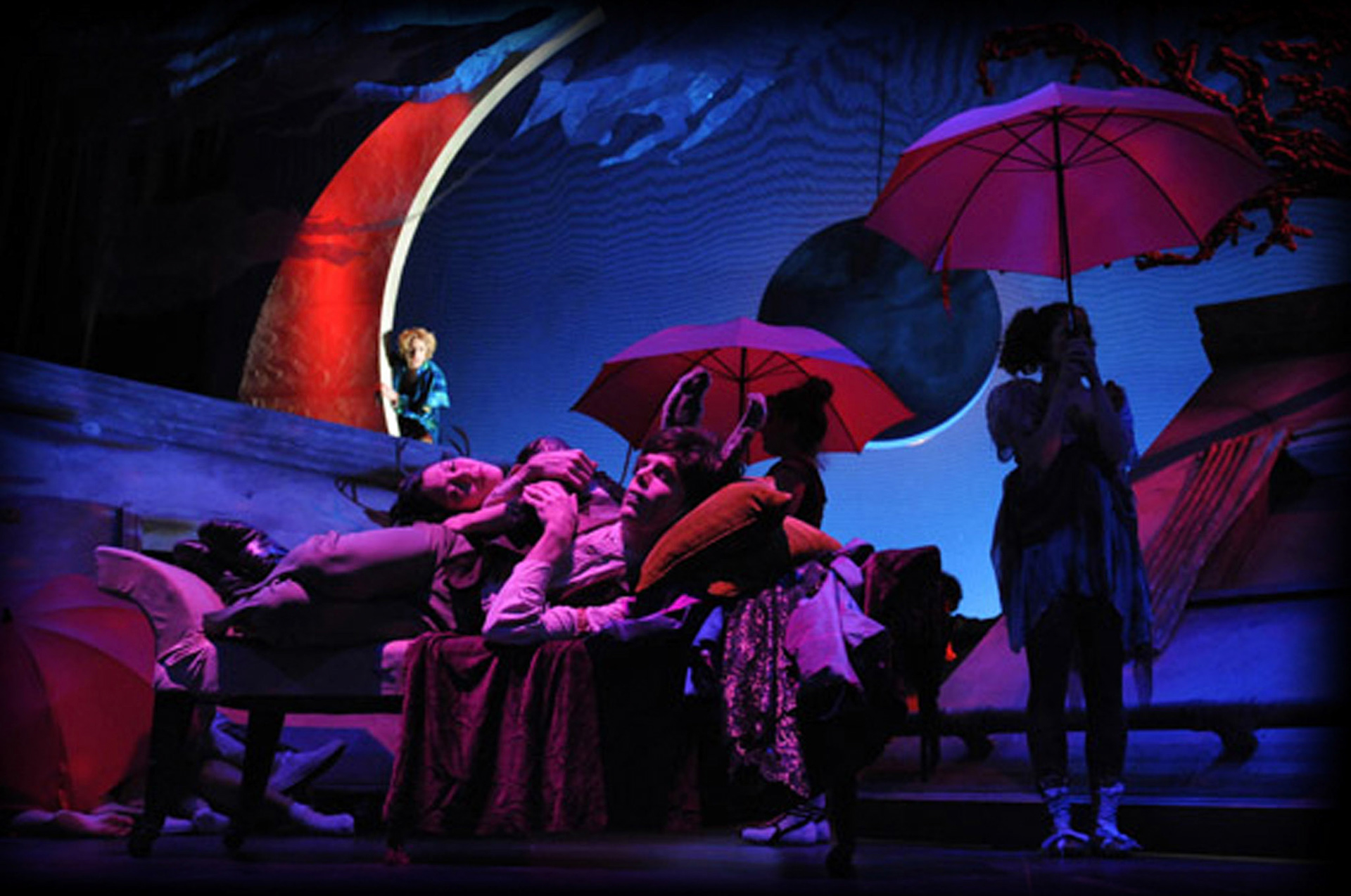 The walls of the A Midsummer Night's Dream set featured a pneumatic piston system that enabled the walls to be lowered from 90 degrees to a slanted angle. The rigid upright walls were for the everyday world of Athens, while the slanted walls represented the wild, overgrown night time chaos of the Forest. Director Michael Butler wished to stage the classic play in a non-traditional way. Butler says, « Midsummer has two distinct worlds: that of the Court with all its rules and constraints, and the forest, which is anarchic, mischievous, erotic. I thought of the play as a gleeful and unruly rebellion of the imagination against all those forces that tell us what we're supposed to do. I wanted also to play with strange intersections of dream world with real world, like vines invading our hair while we sleep. So rather than keep the two worlds separate, Kim and I wanted the world of the Court to be taken over and transformed by the forest, much the way it might happen in a dream where the familiar can suddenly alter in strange ways. »