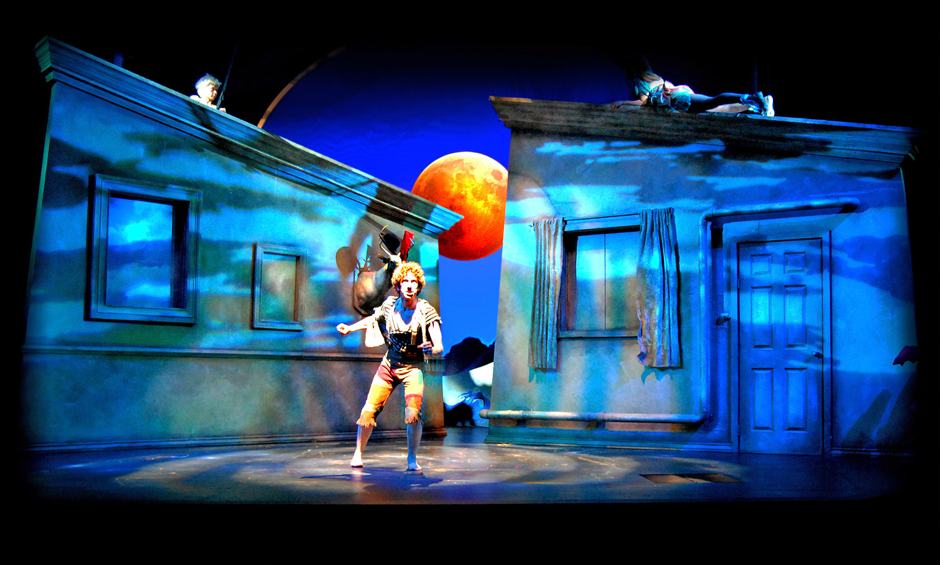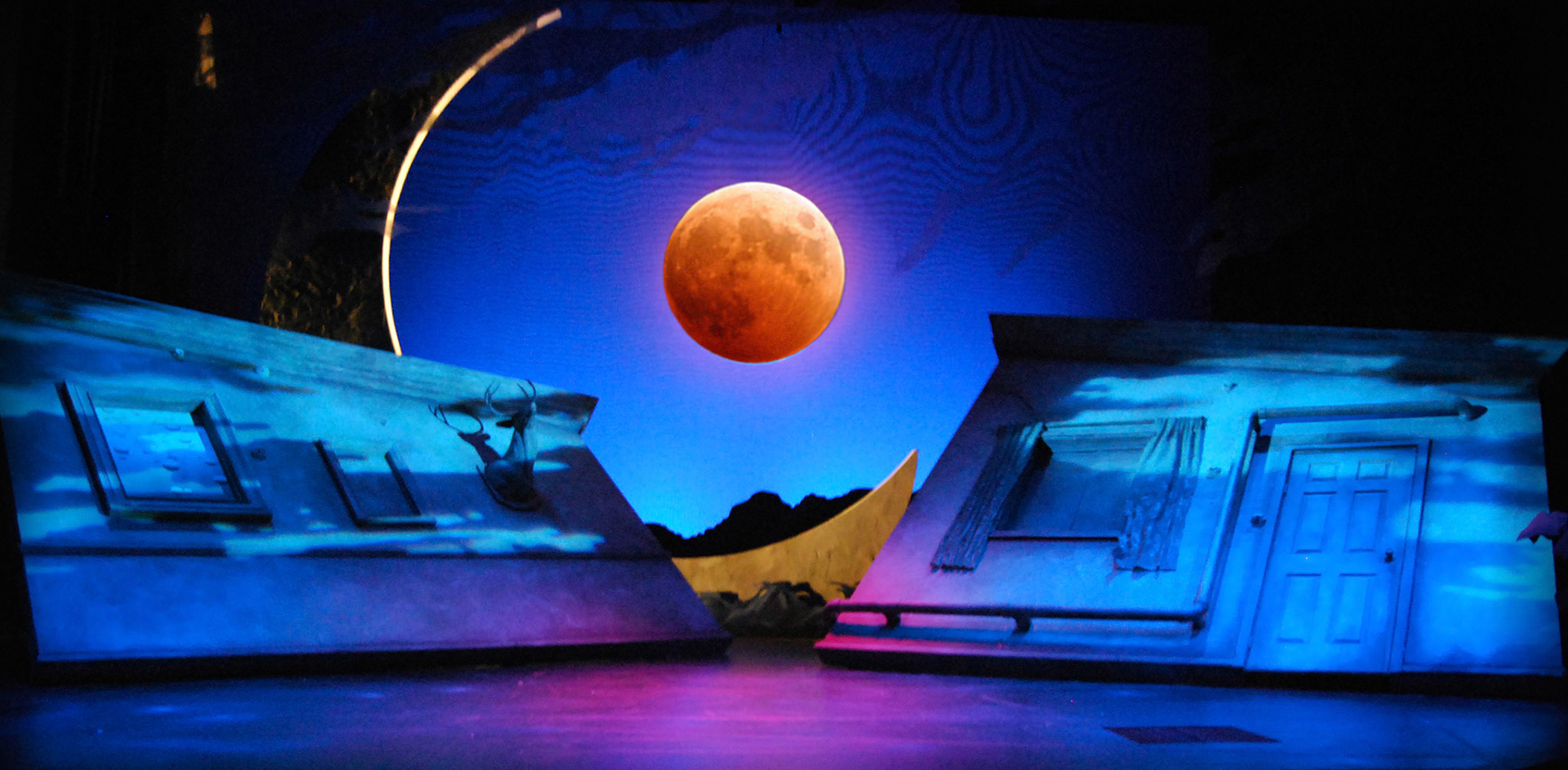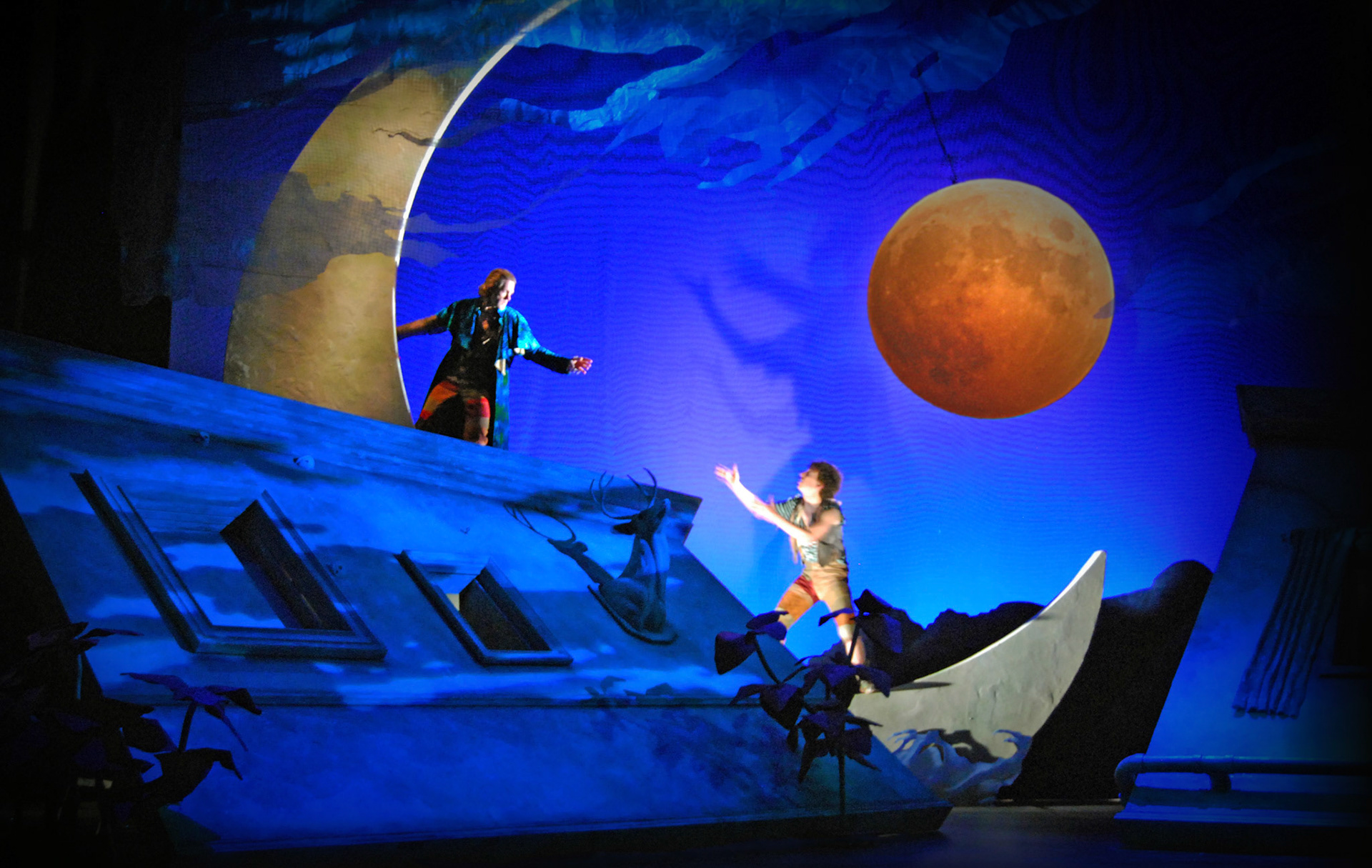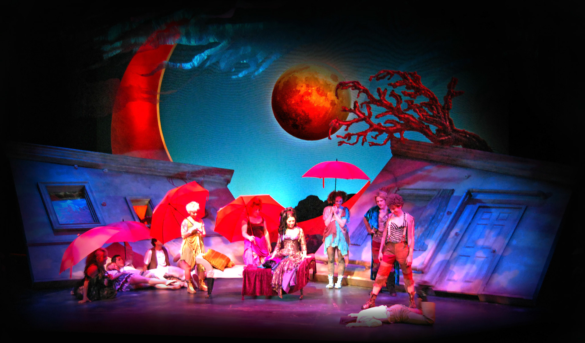 The walls of the A Midsummer Night's Dream set featured a pneumatic piston system that enabled the walls to be lowered from 90 degrees to a slanted angle. The rigid upright walls were for the everyday world of Athens, while the slanted walls represented the wild, overgrown night time chaos of the Forest. Director Michael Butler wished to stage the classic play in a non-traditional way. Butler says, « Midsummer has two distinct worlds: that of the Court with all its rules and constraints, and the forest, which is anarchic, mischievous, erotic. I thought of the play as a gleeful and unruly rebellion of the imagination against all those forces that tell us what we're supposed to do. I wanted also to play with strange intersections of dream world with real world, like vines invading our hair while we sleep. So rather than keep the two worlds separate, Kim and I wanted the world of the Court to be taken over and transformed by the forest, much the way it might happen in a dream where the familiar can suddenly alter in strange ways. »